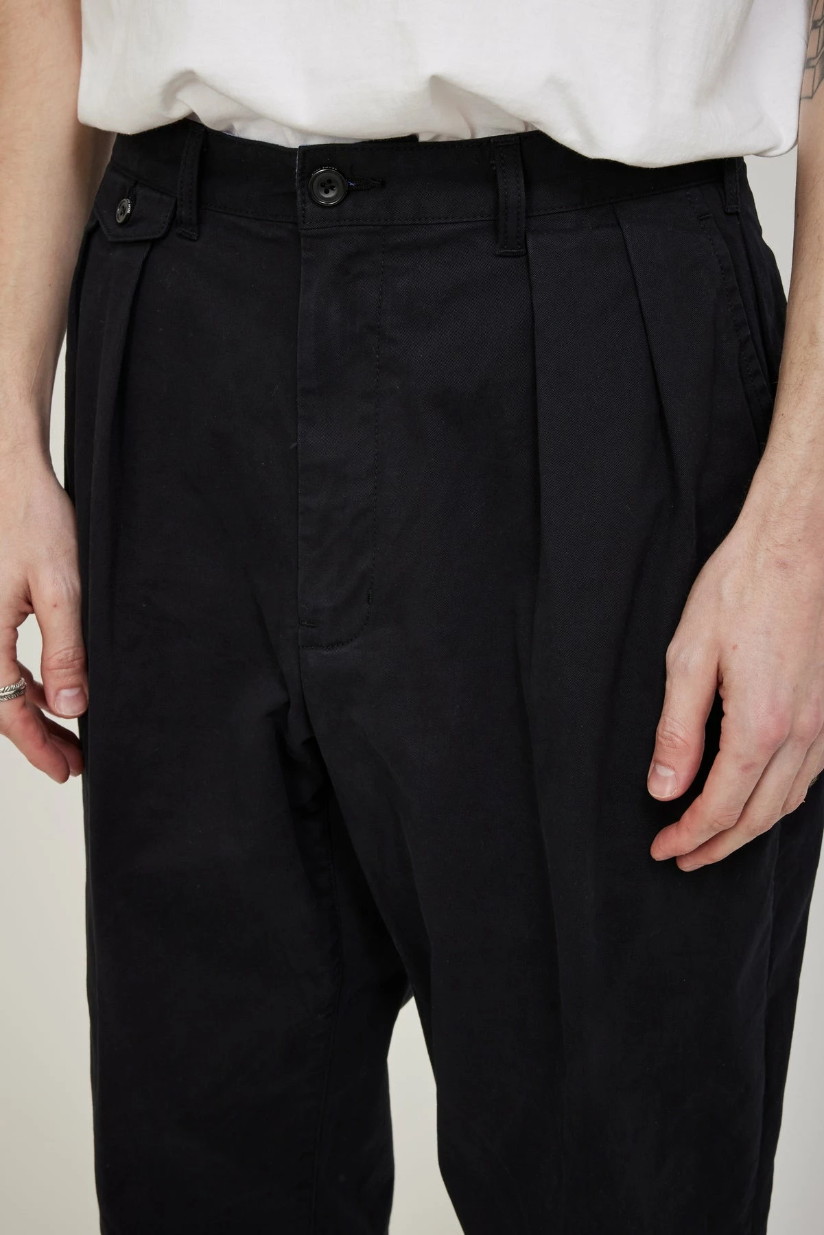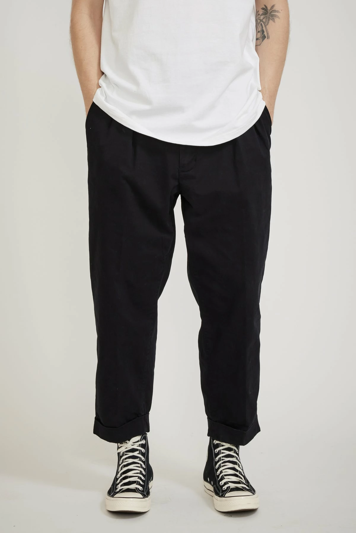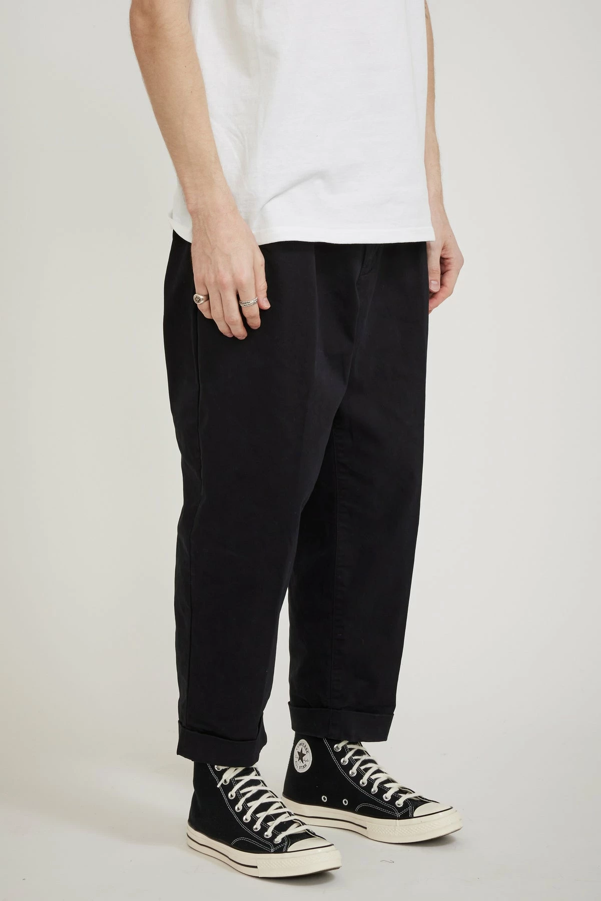 Cut wide through the thigh with a nice clean taper, shorter cropped with a single roll at the cuff, reminiscent of turn of the century balloon pants. The waist is a classic mid rise with two pleats either side for a smooth shape, finished with a zip fly and an extra front button flap pocket for essentials.