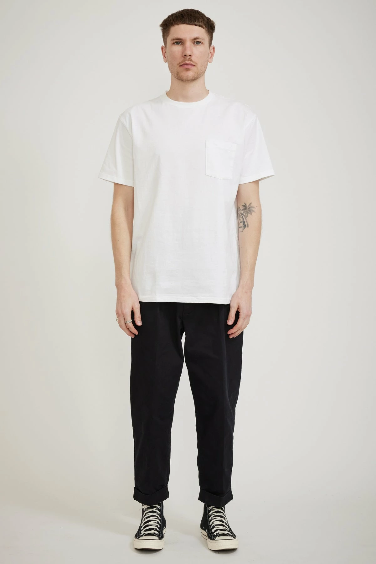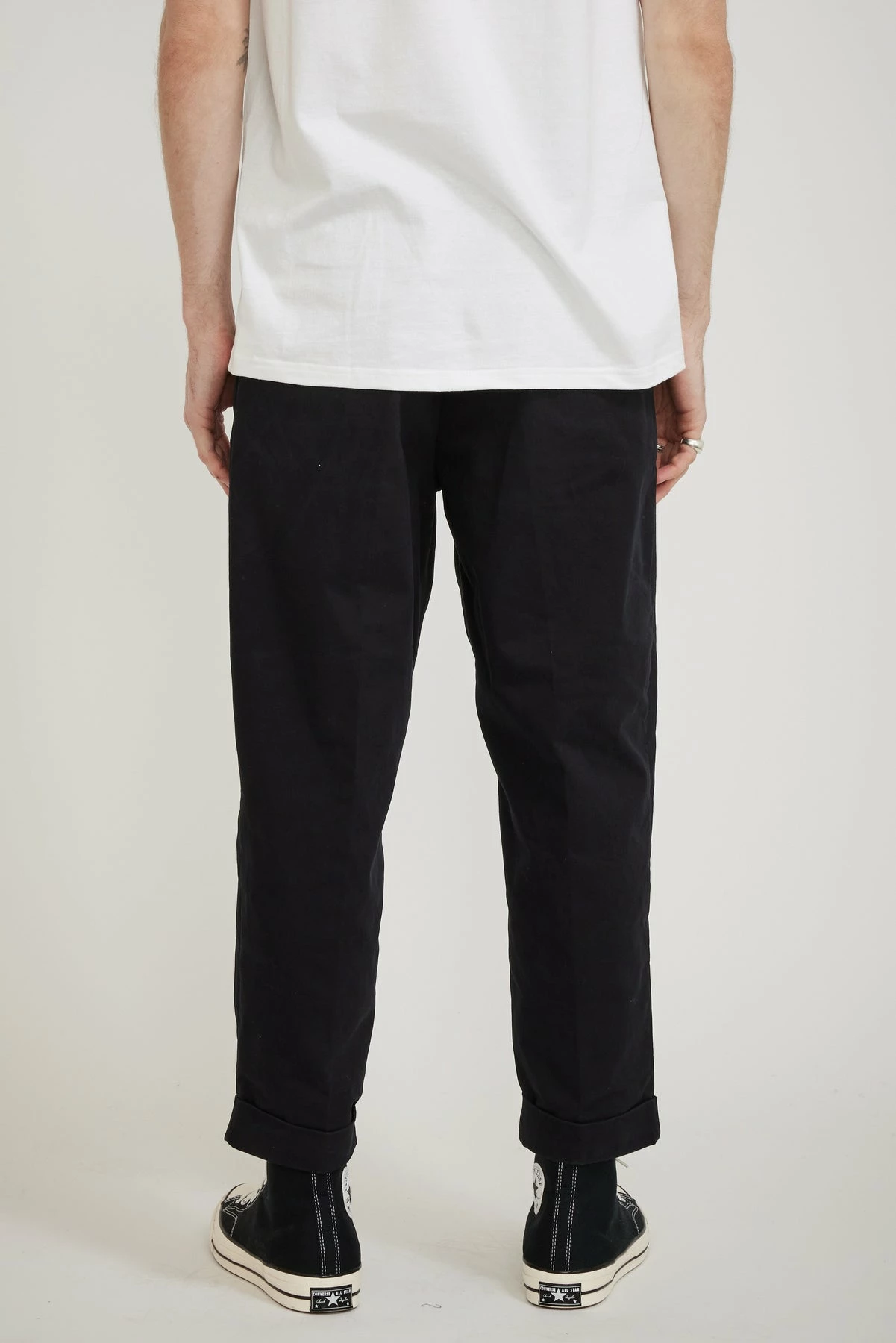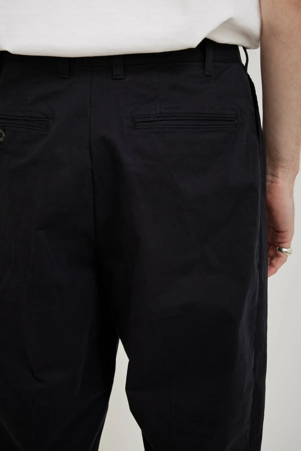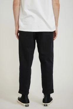 Cut wide through the thigh with a nice clean taper, shorter cropped with a single roll at the cuff, reminiscent of turn of the century balloon pants. The waist is a classic mid rise with two pleats either side for a smooth shape, finished with a zip fly and an extra front button flap pocket for essentials.