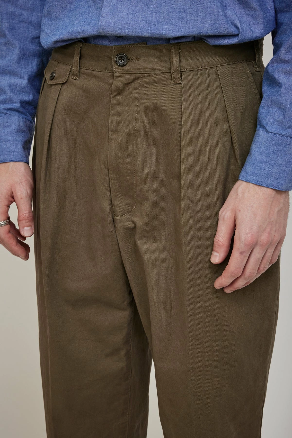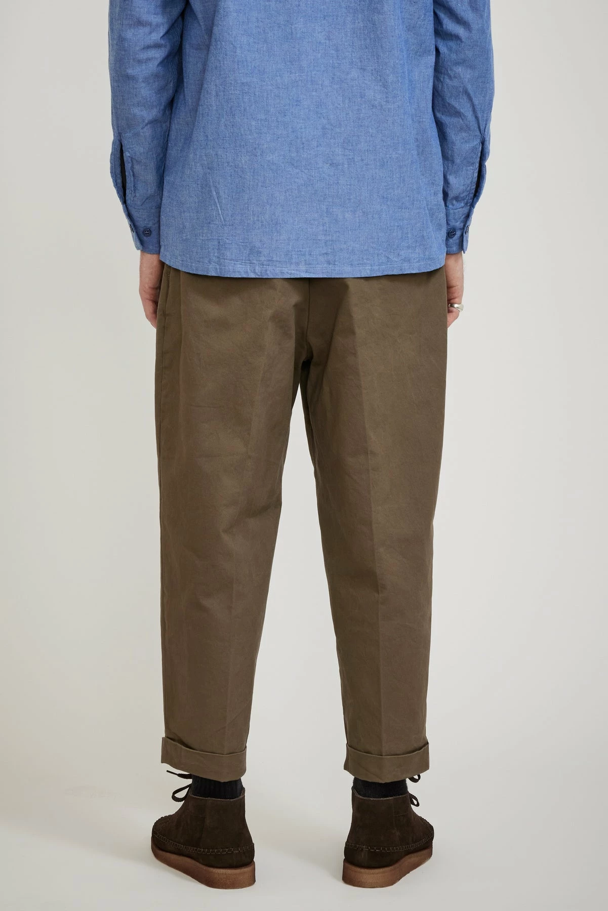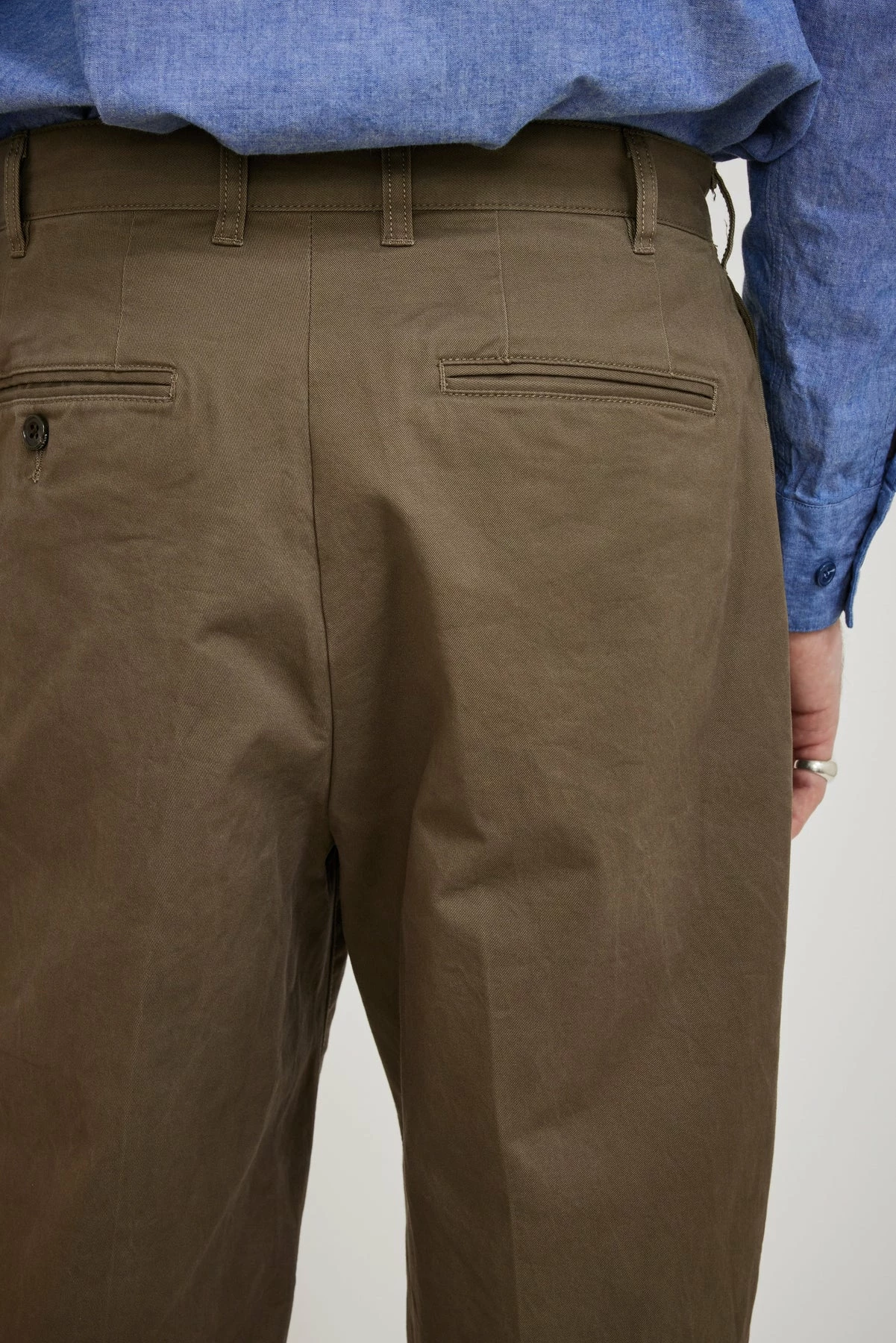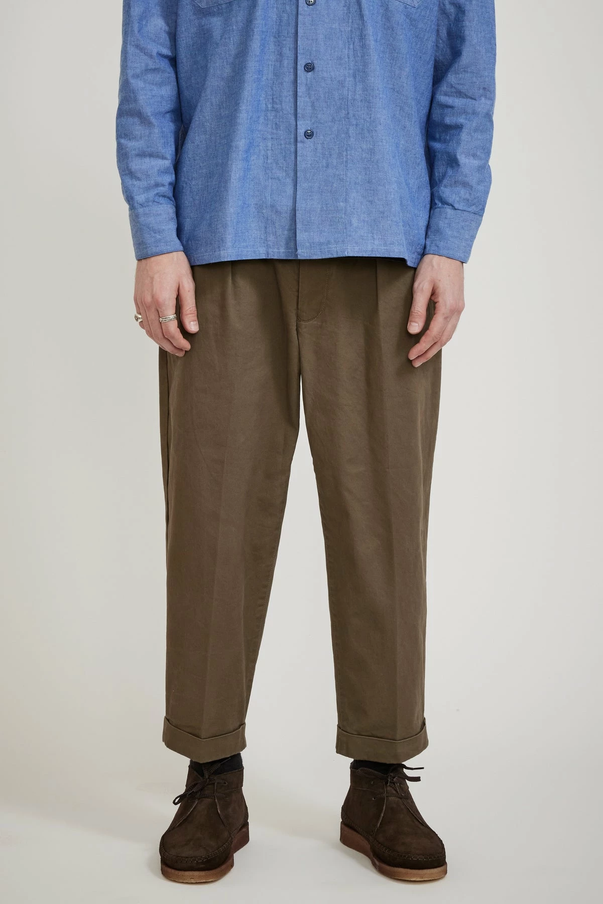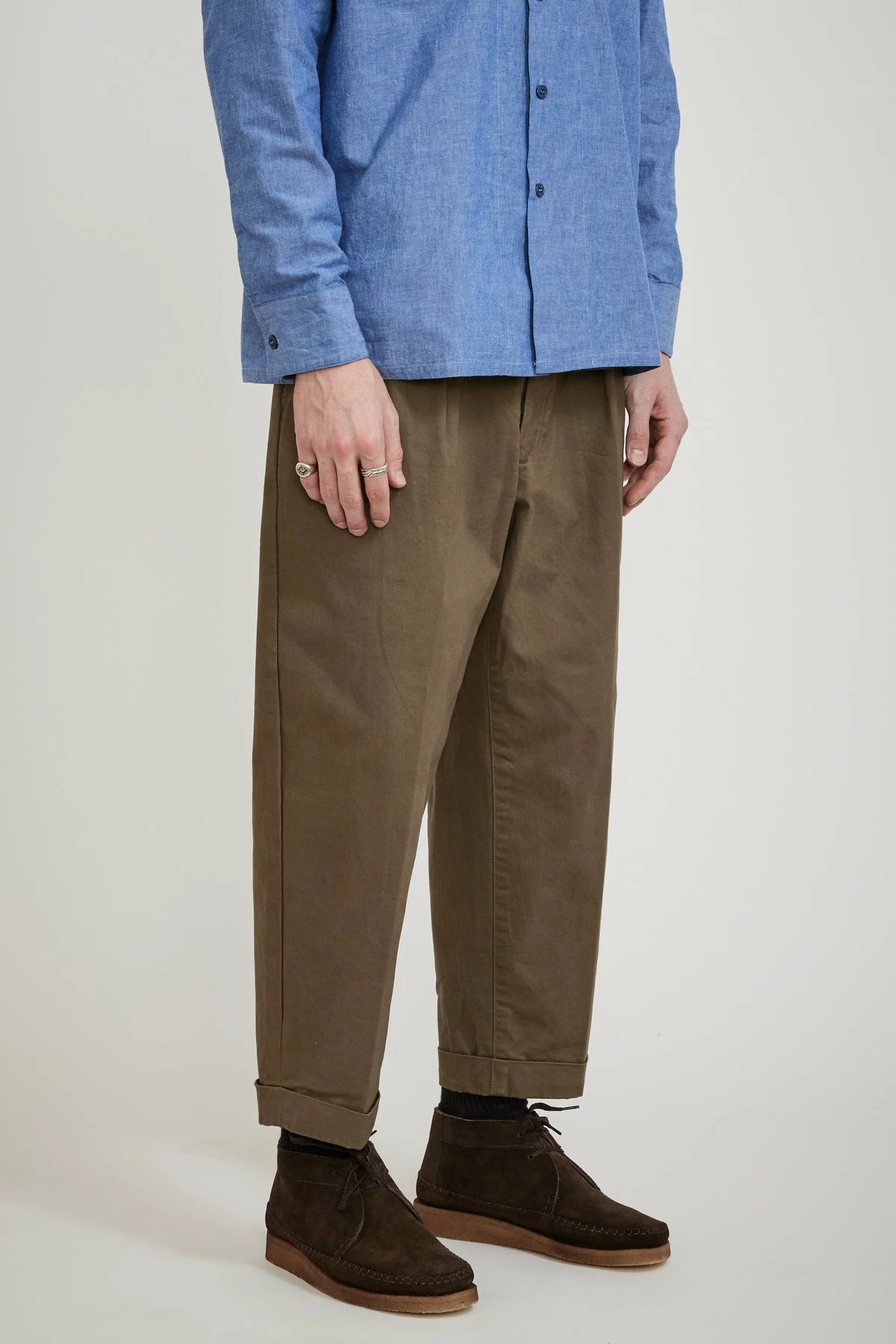Cut wide through the thigh with a nice clean taper, shorter cropped with a single roll at the cuff, reminiscent of turn of the century balloon pants. The waist is a classic mid rise with two pleats either side for a smooth shape, finished with a zip fly and an extra front button flap pocket for essentials.