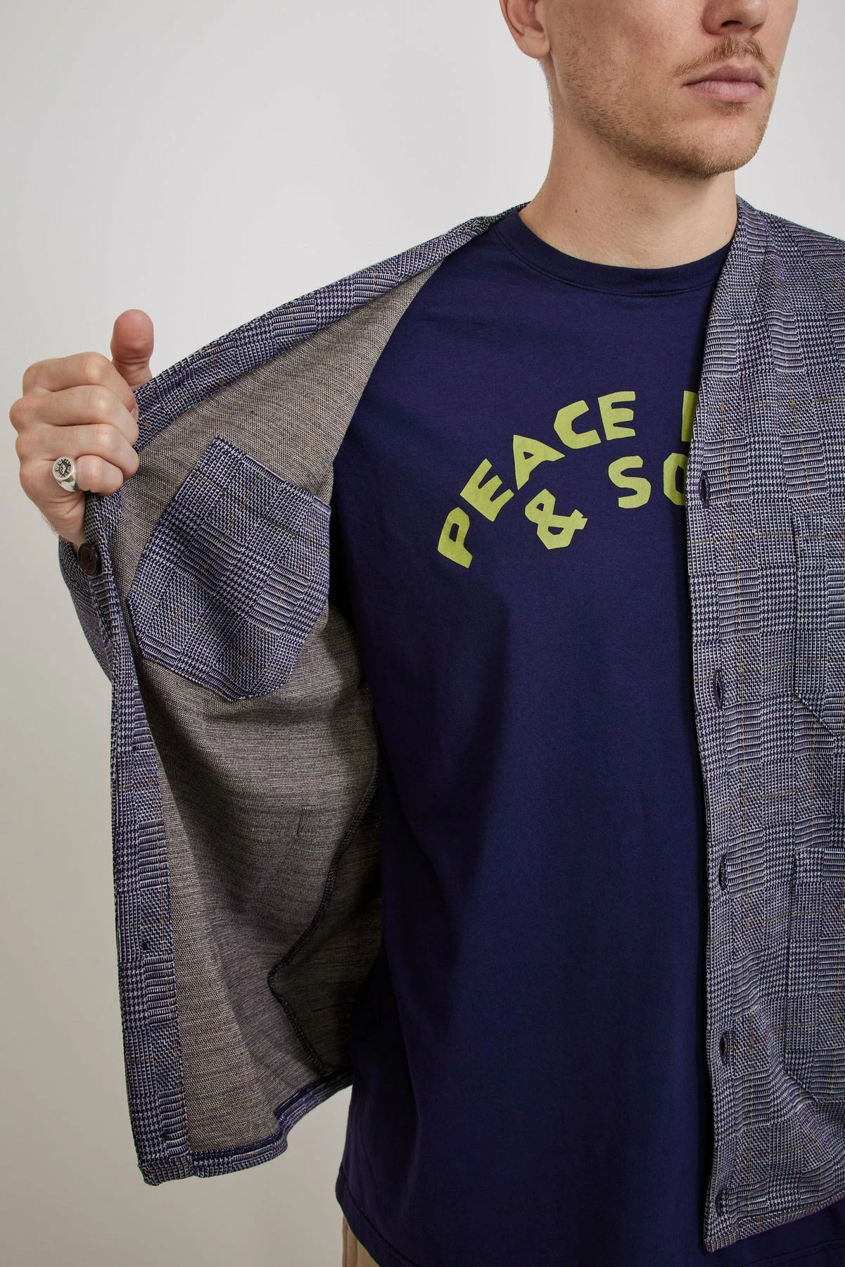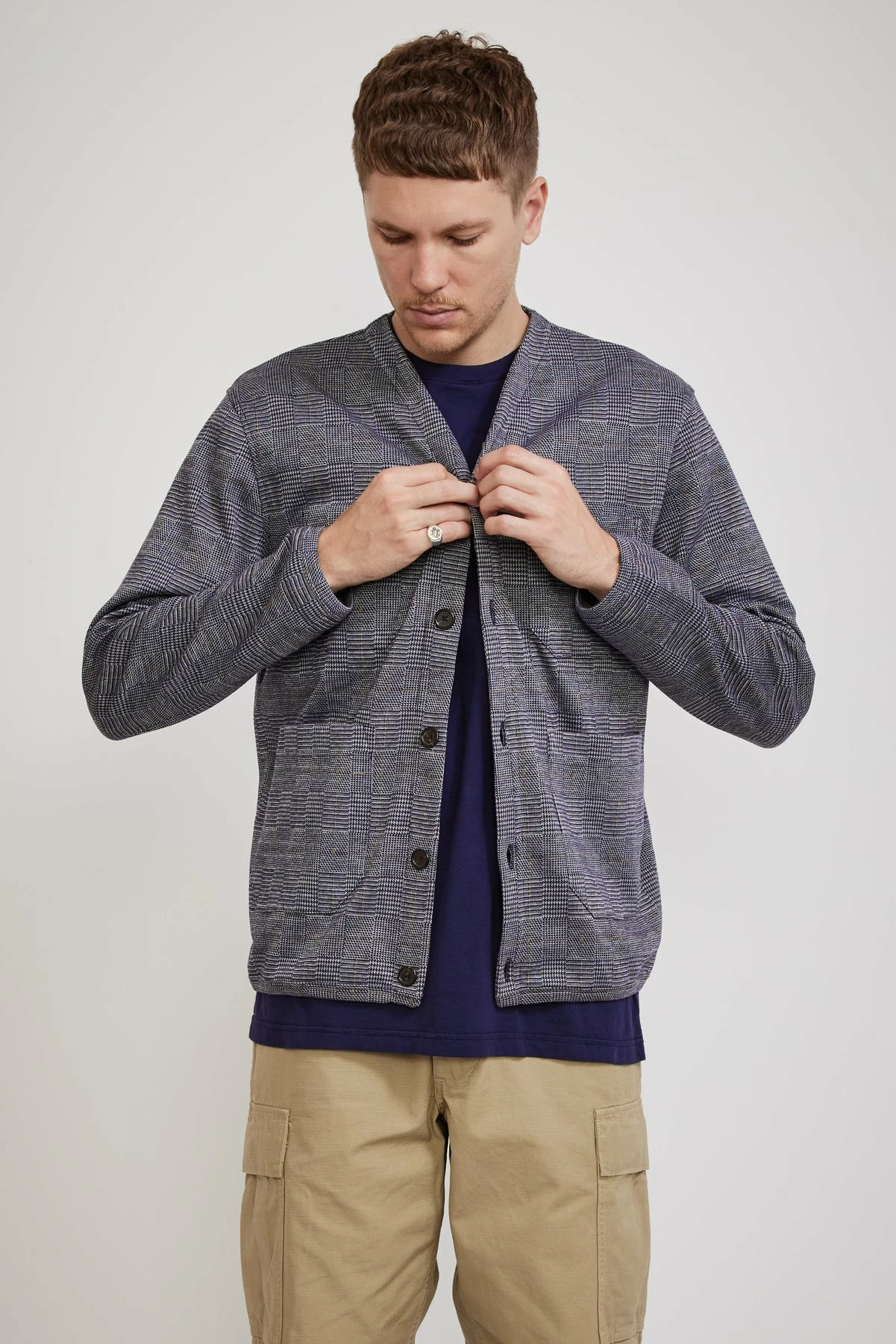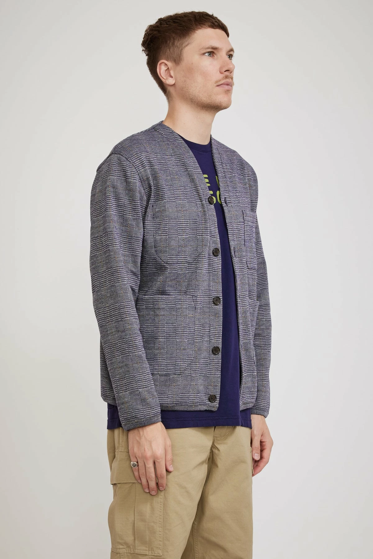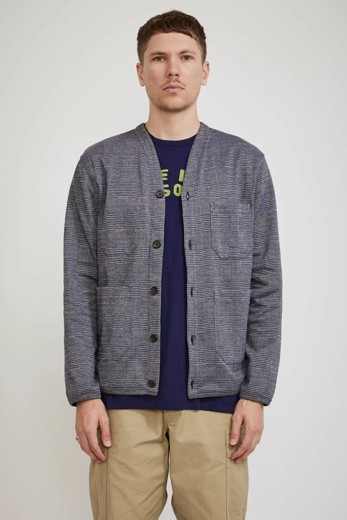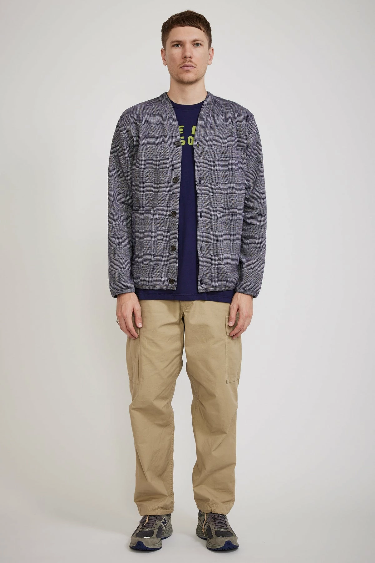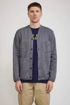 Our favourite core shape from Universal Works, a versatile v neck cardigan. The fabric looks seriously good up close this season, cut from a cotton poly fleece blend in a woven Prince of Wales check. Features five button front closure, subtle v-neck, jersey-bound cuffs hem and placket and multi-use patch pockets.