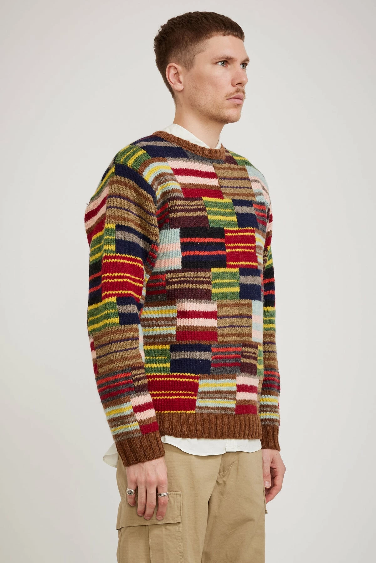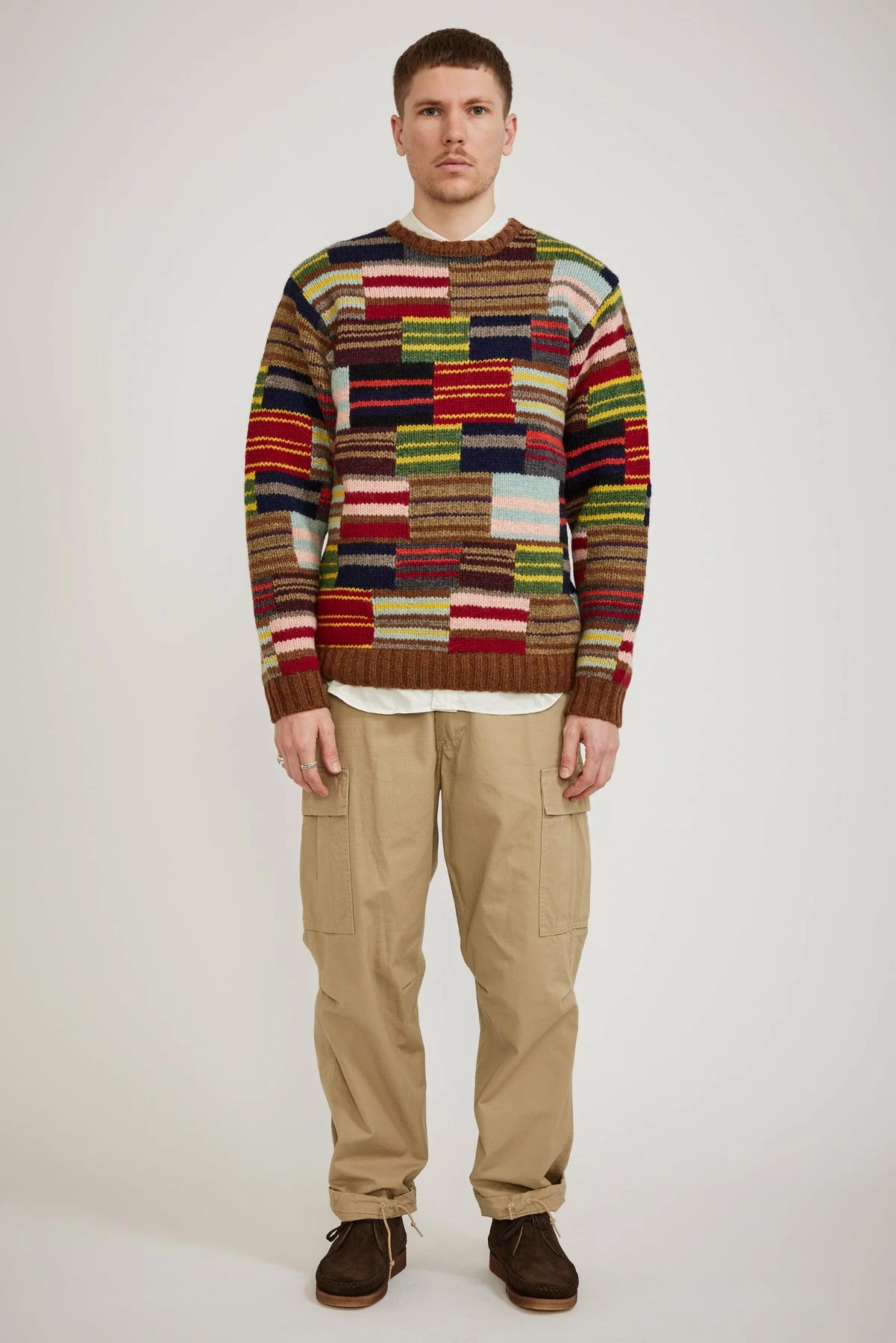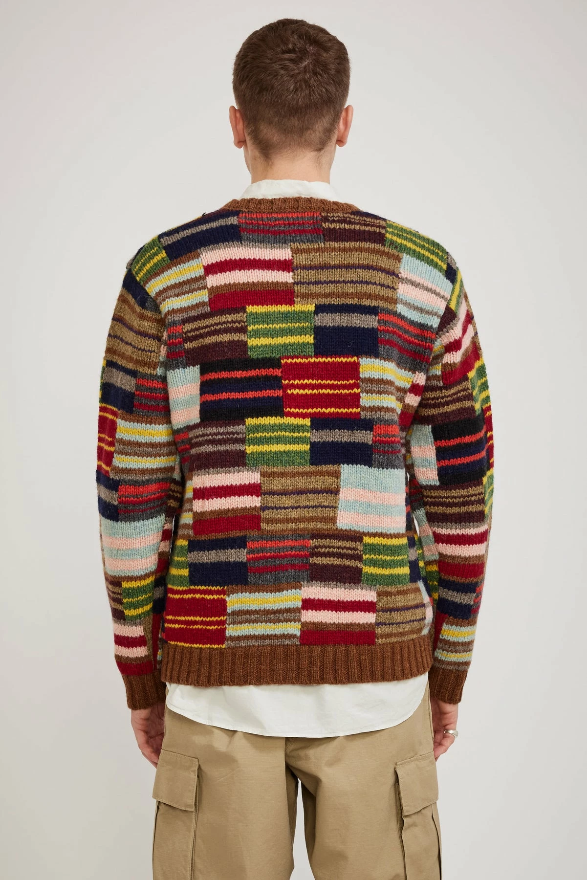 Hand Knitted like your grandma used too, this Patchwork Strip Knit from Beams Plus was carefully made from scratch using Shetland wool. The unique colour and stripe pattern was carefully chosen for just the right amount of contrast. Knitted from a mix of 3 and 5 gauge yarn for a slightly uneven finish giving a true vintage feel that only hand knitting can express.
