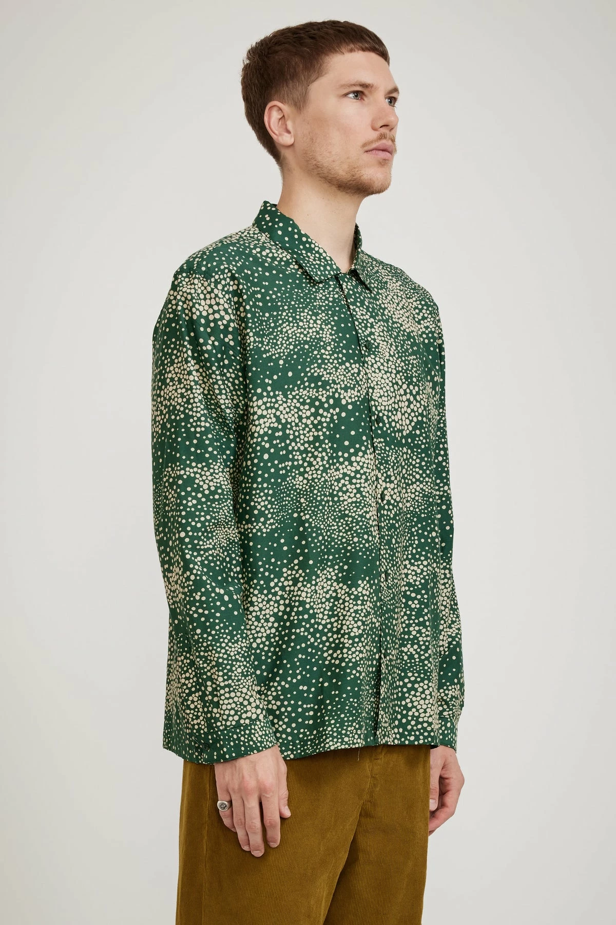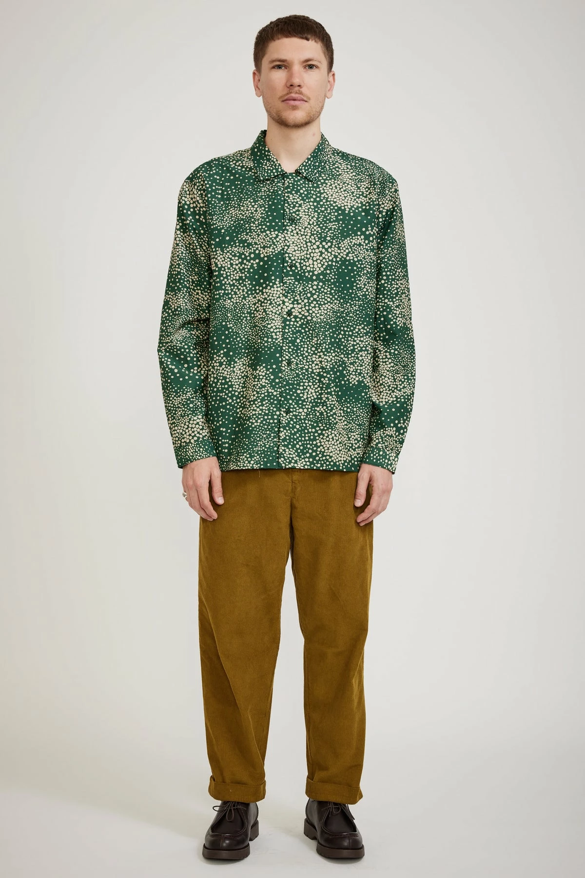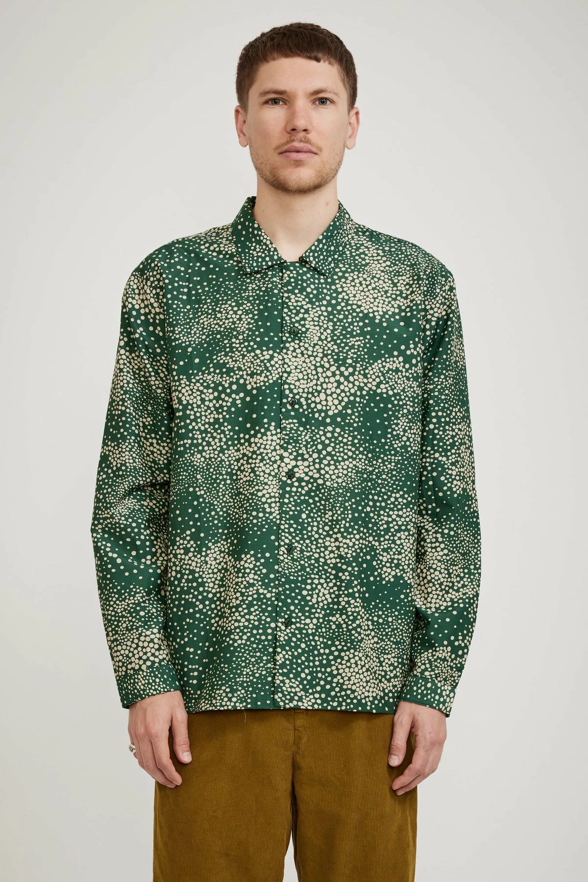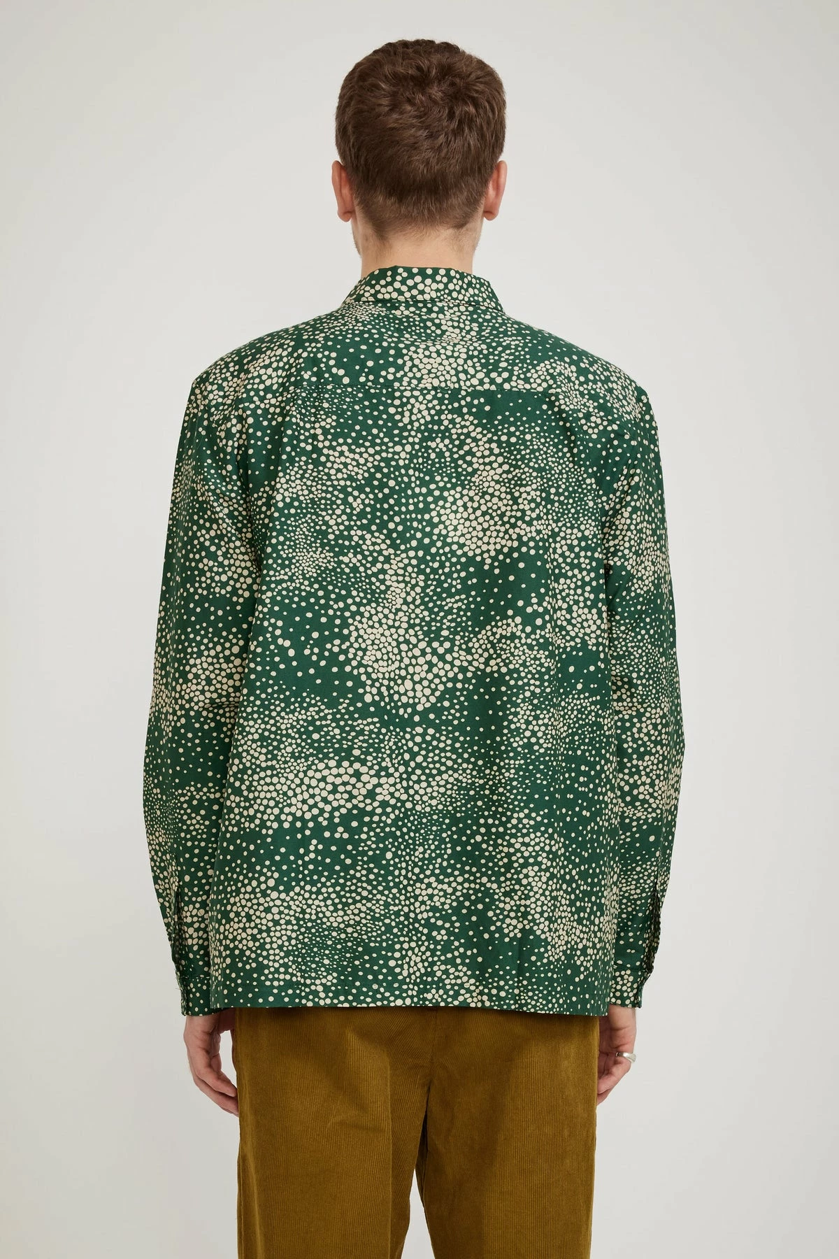 Made from a silk and cotton blend the Feathers shirt from YMC makes a great statement piece. The all over print is reminiscent of a snowstorm and the movement given by the fabric continues this theme. A relaxed cut through the shoulders and body with a square hemline to hold the boxy shape. The collar can be worn neat or as an open camp collar with a fabric loop closure on the top button.