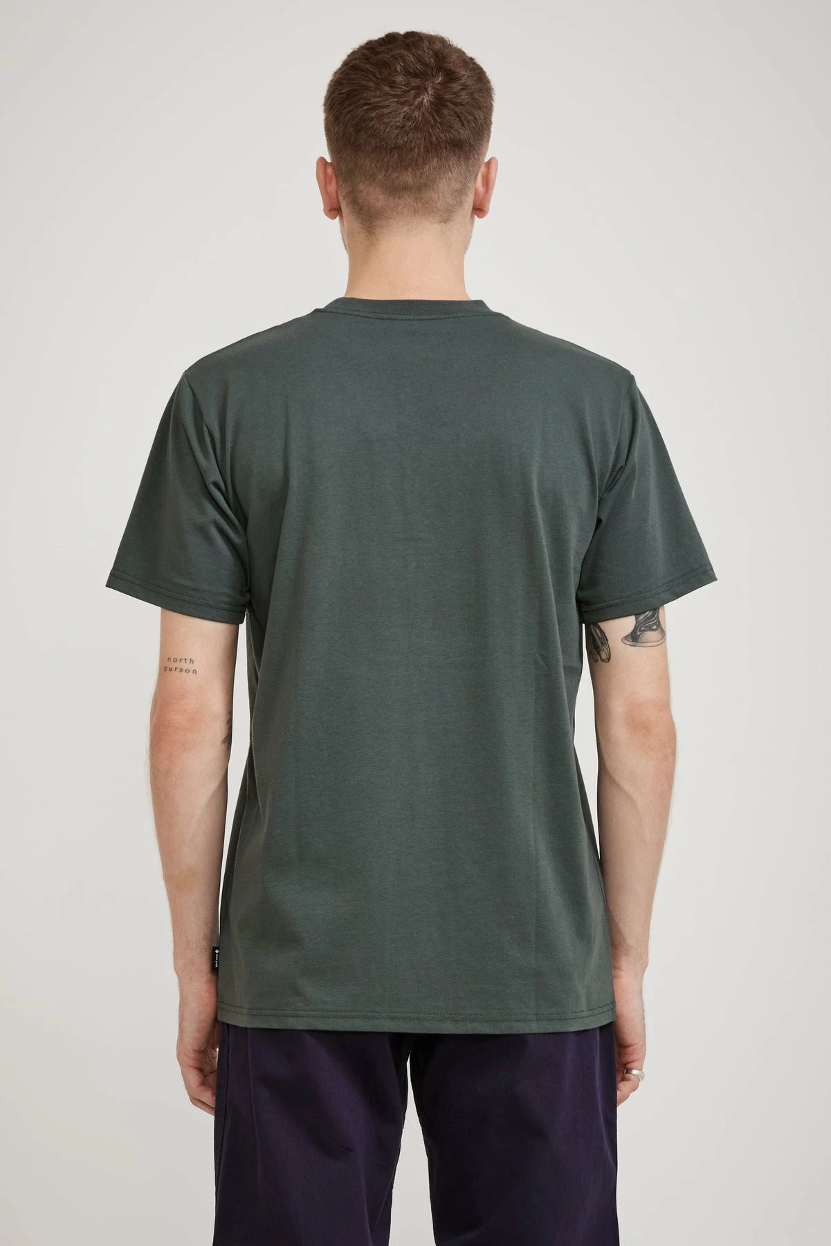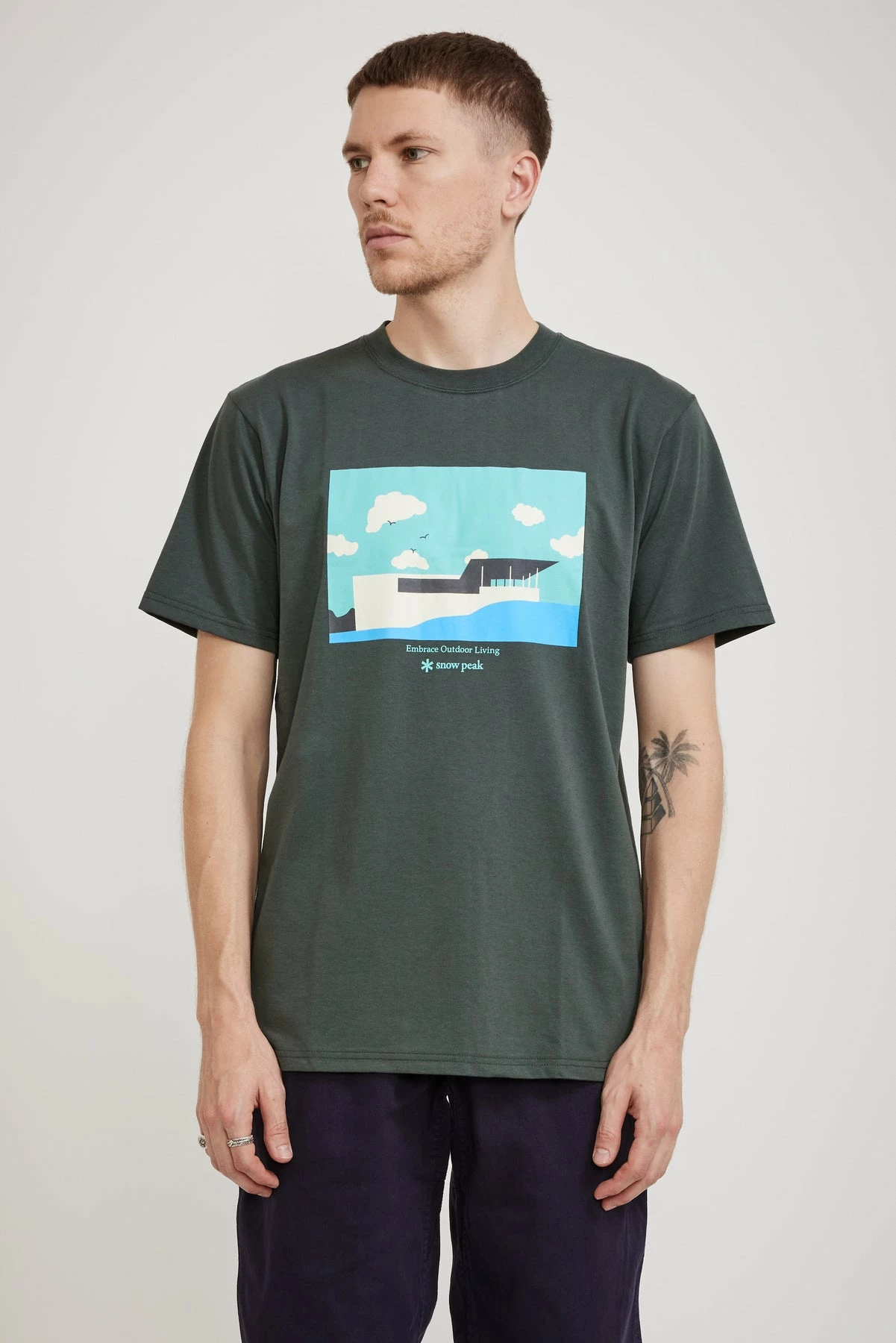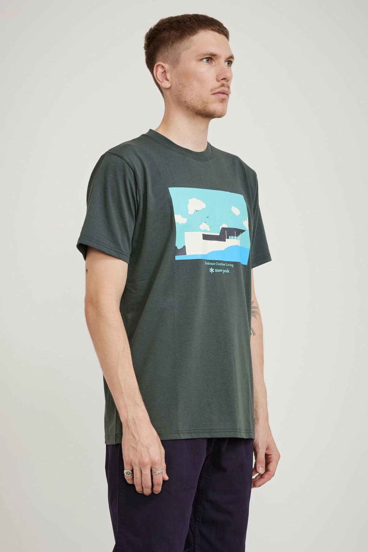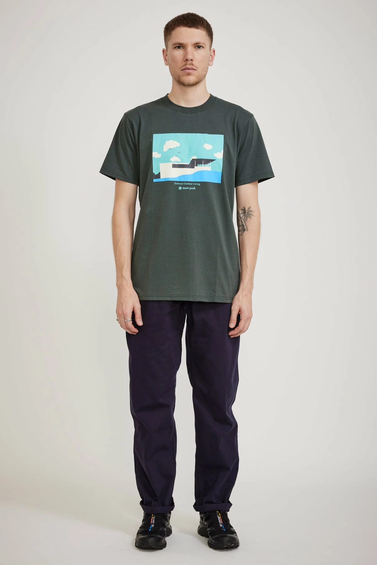 Snow Peak Headquarters and campsite are front and centre on this soft organic cotton and recycled polyester blend tee.