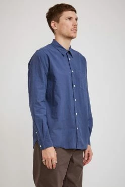 The Osvald regular fit shirt from Norse Projects is ideal for those who wants a bit more length without the extra width. Opting for a Cotton and Tencel blend with excellent breathability, it gives an almost matte finish to the shirting that looks excellent in the calcite blue wash. Simple detailing with a patch chest pocket and mother of pearl buttons, the light-weight fabric has minimal transparency. The fit is regular through the body and shoulders with a long body and sleeves.