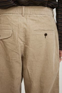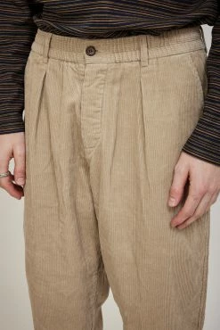 Slacks in every sense of the word, the Pleated Track Pants from Universal Works are a very wide loose pant with a slight taper in towards the ankle, giving the look of an old school balloon pant. The elasticated waist is smartened up with belt loops and a button closure as well as two front pleats to flatten the shape along the waistline. Four pockets two at the side seam and two back button pockets, one flap and one welted. Can be worn as a suit set for those who dare, with the Baker jacket in the same stone corduroy.