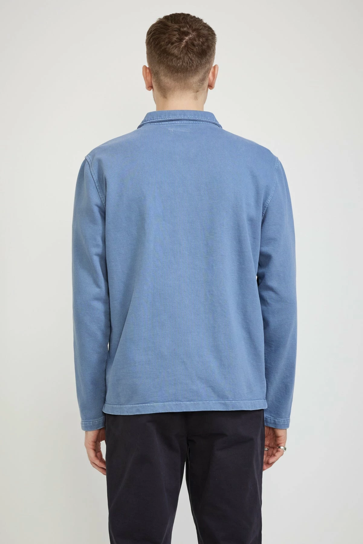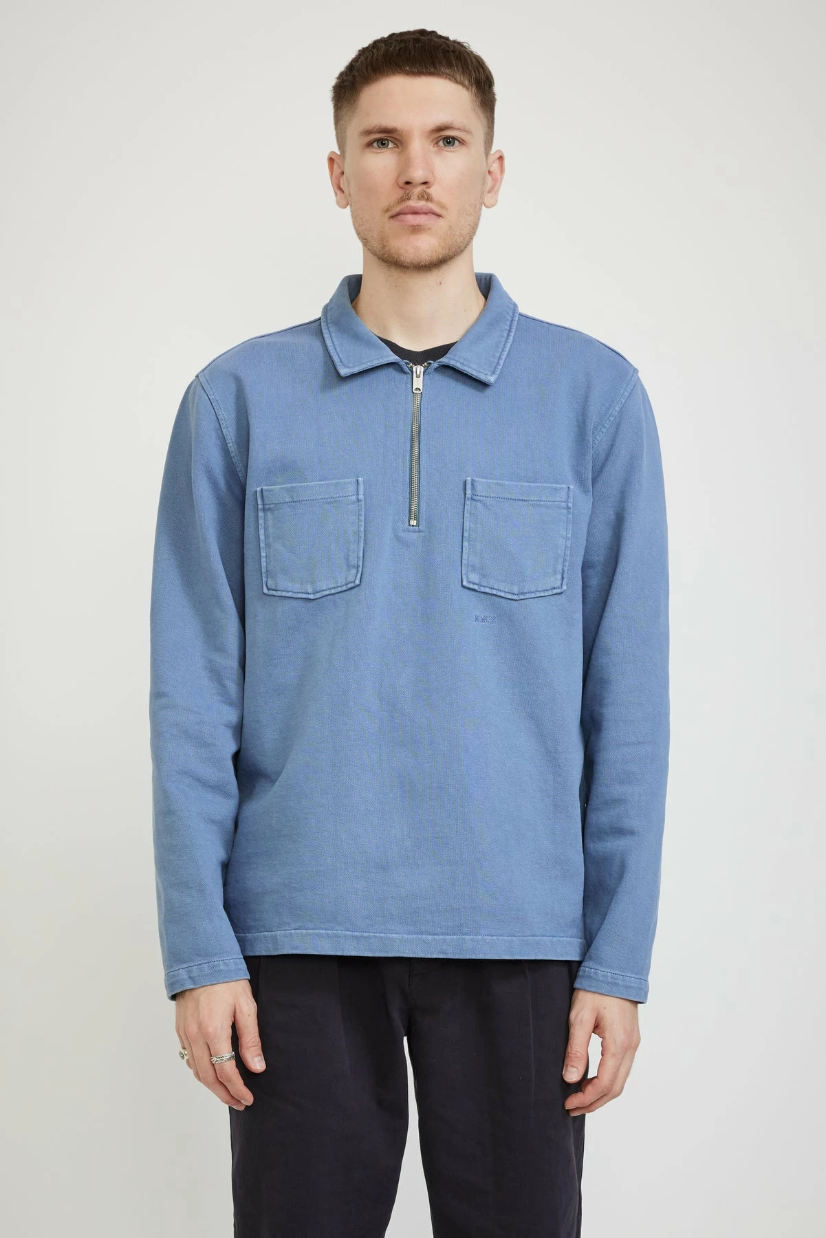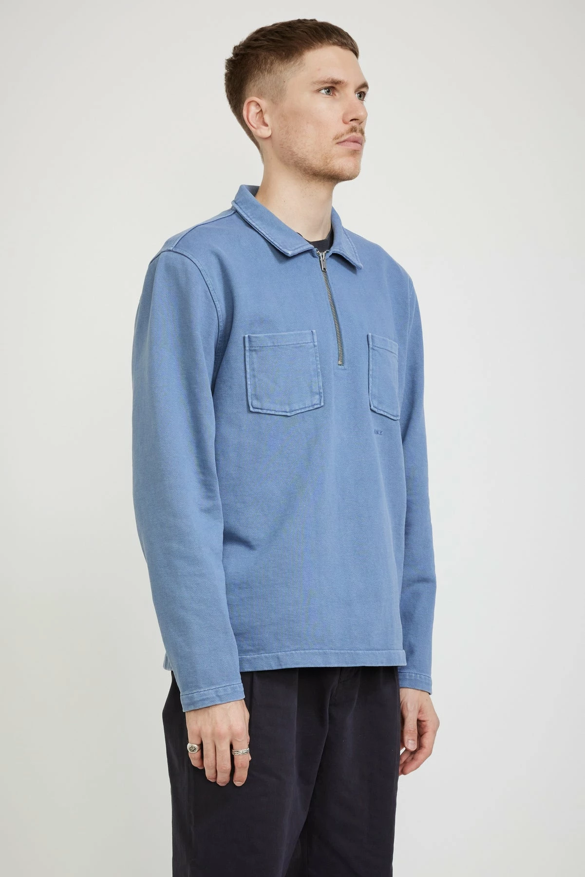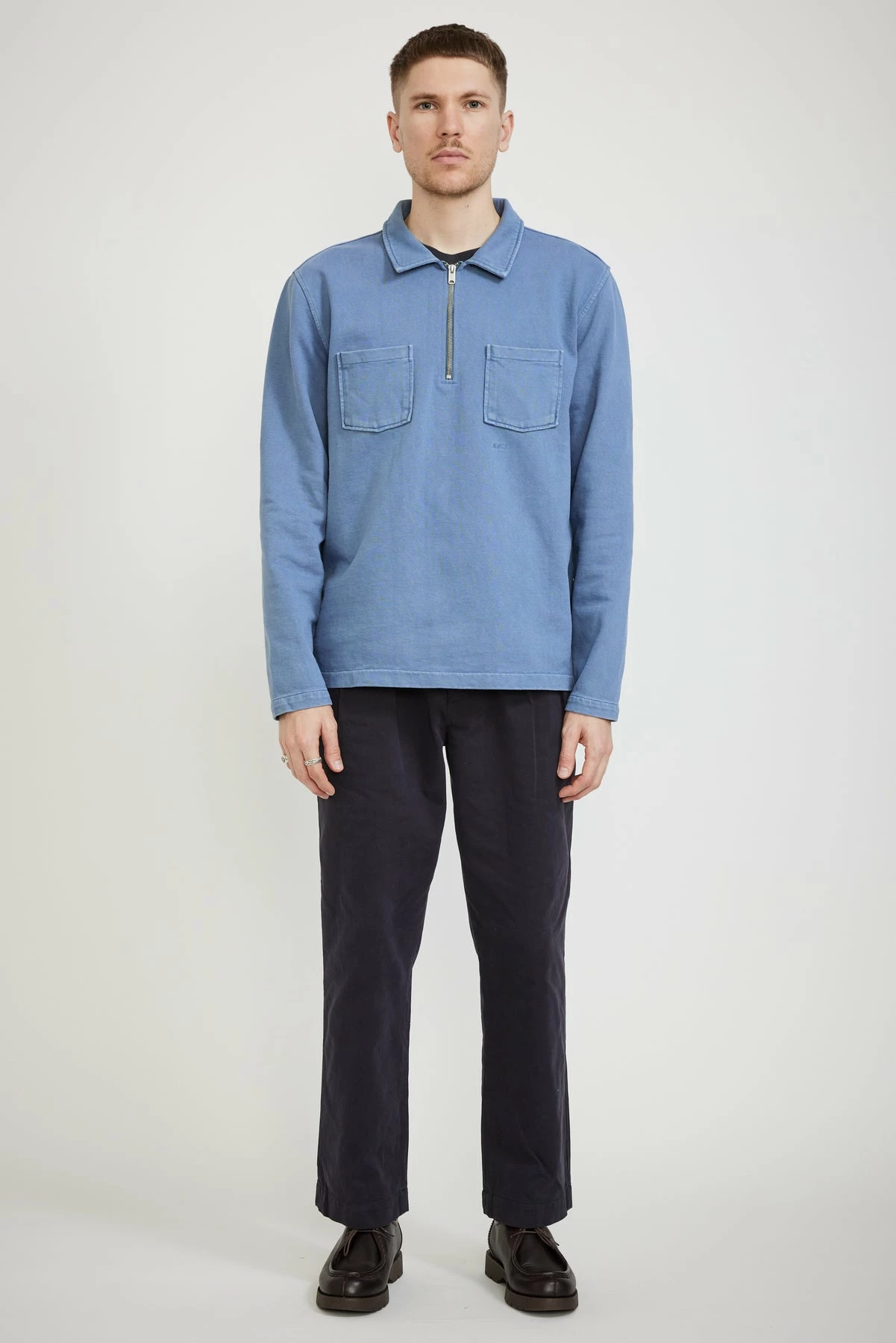 The Compact Knit Quarter Zip shirt from Knickerbocker NYC returns in a pigment dyed Marine blue. Made of 100% cotton in a dry hand Compact Knit cloth with two neat chest patch pockets.