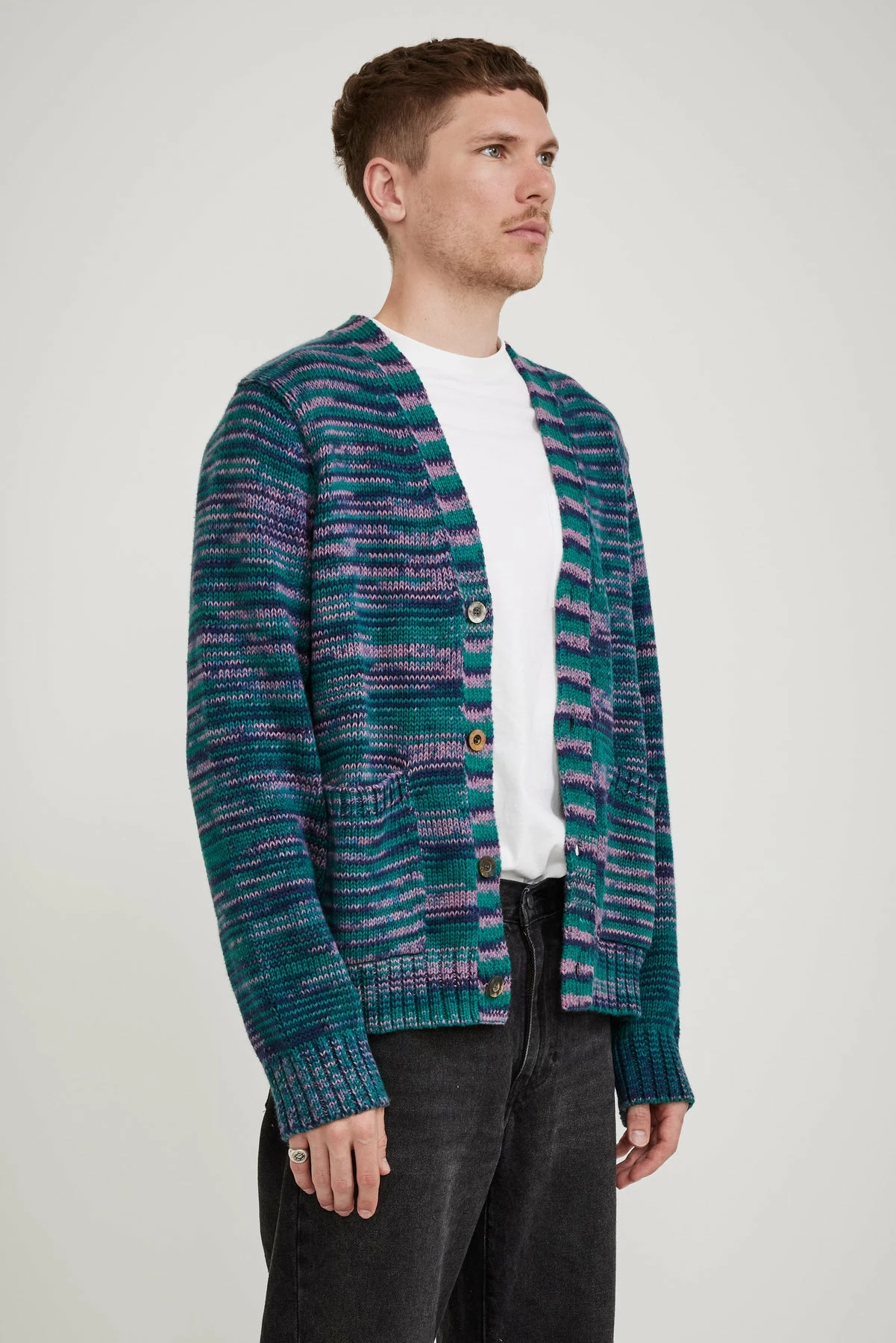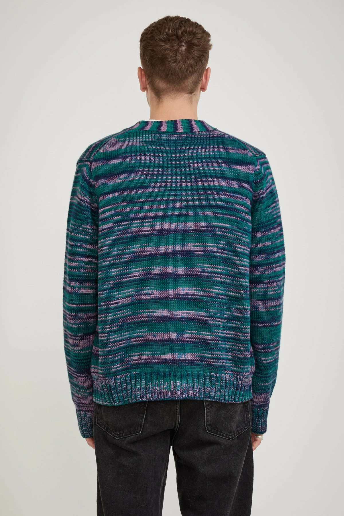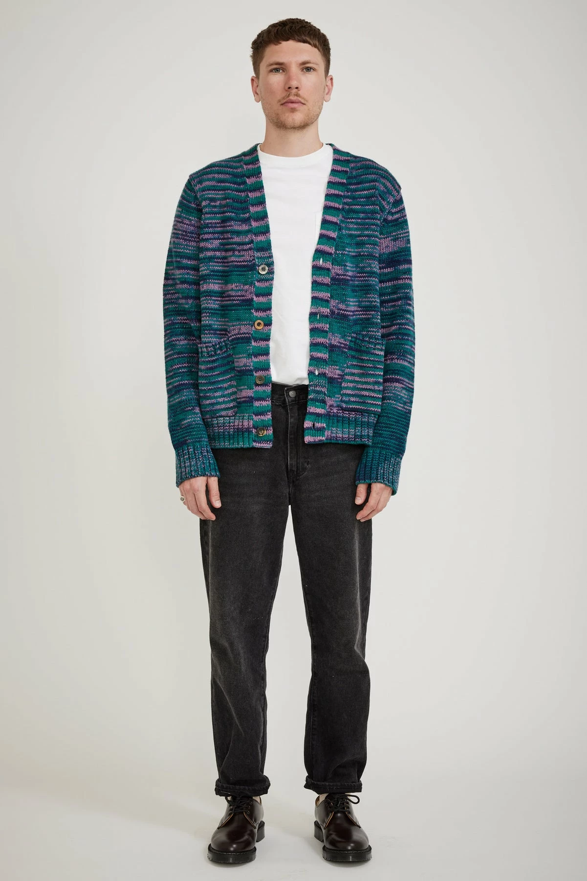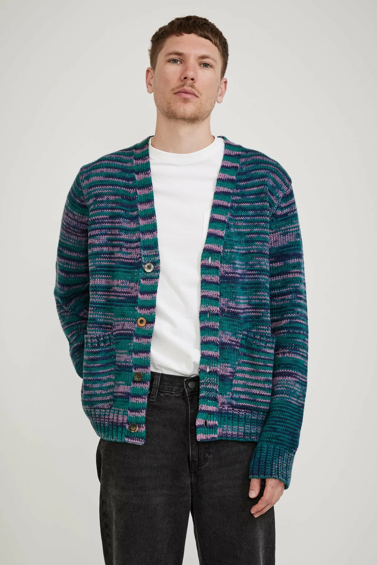 The Corridor Space Dye Cardigan brings a little happiness to the once staid cardigan. Knitted in a perfectly weighted, space dyed cone cotton it has great stitch definition and colour variety.