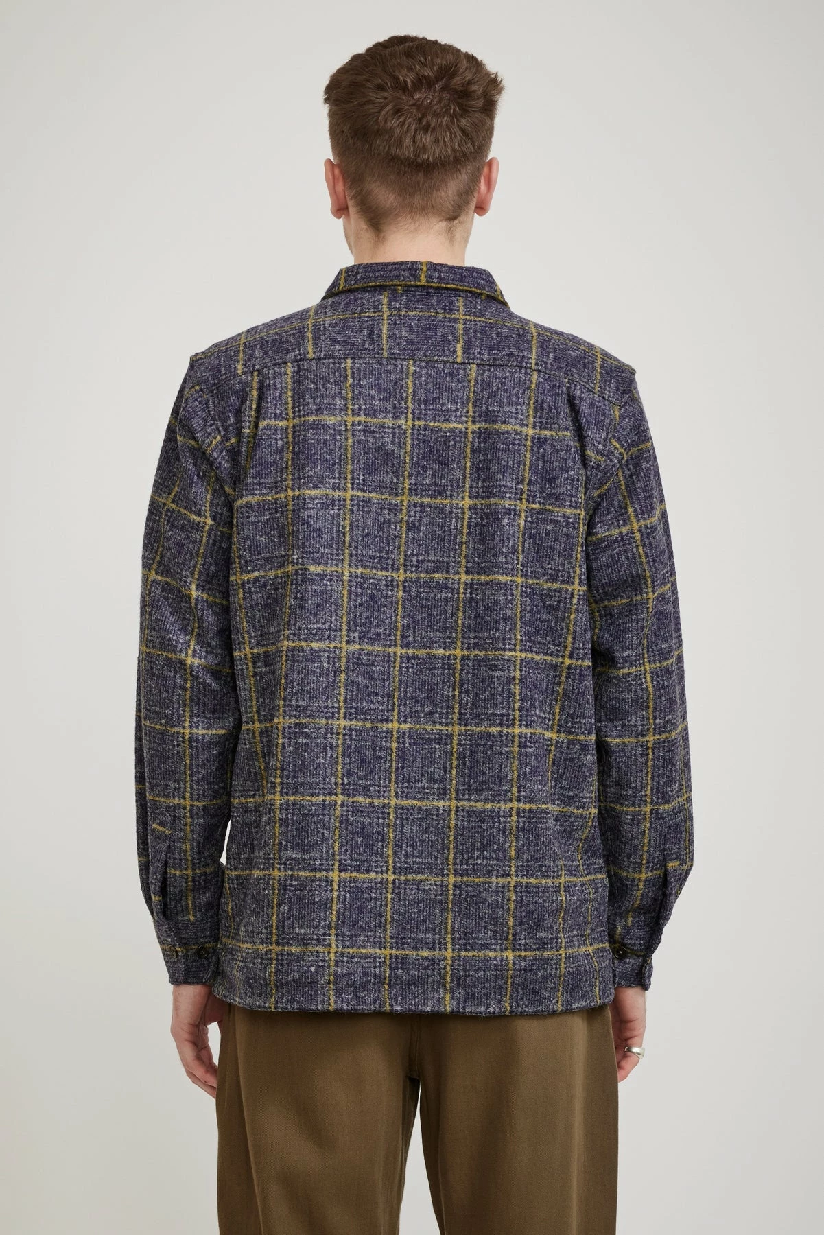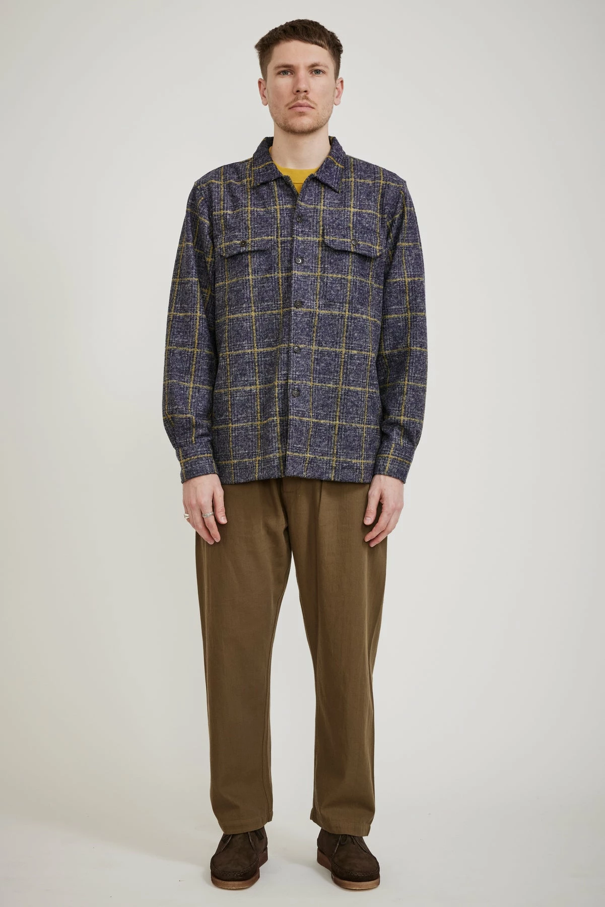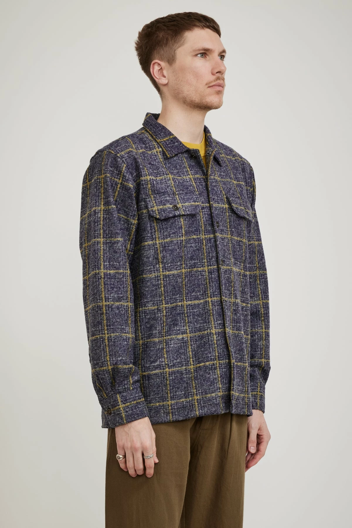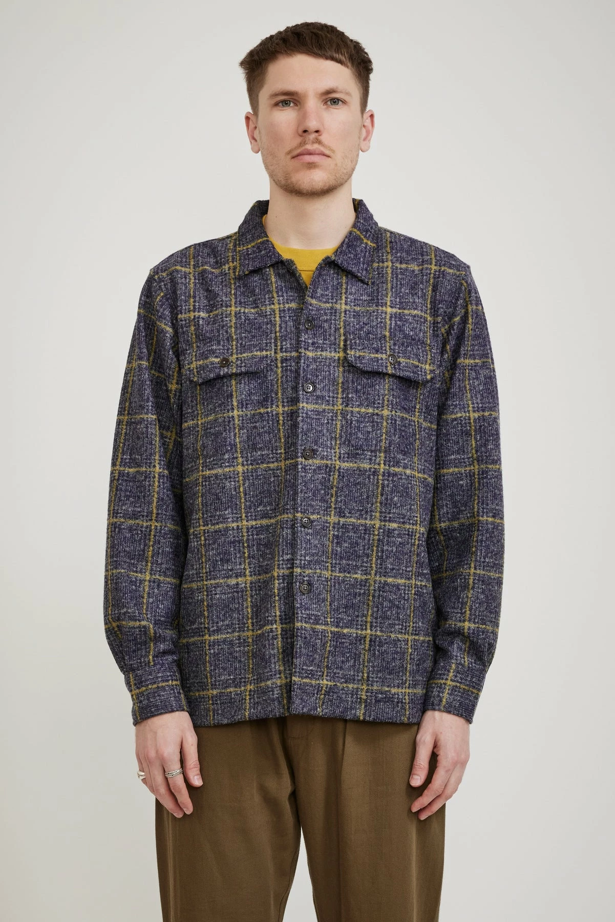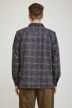 Universal Works version of a mid-century-inspired American ‘Garage’ work shirt, the Utility shirt is oversized with a flat square collar and a straight hem. It has short split sides for a boxy loose fit making it perfect as an over shirt in a soft wool blend. Finished with two large pockets with button-closure flaps, button closure and cuffs as well as a cotton placket lining for a soft feel along the collar.