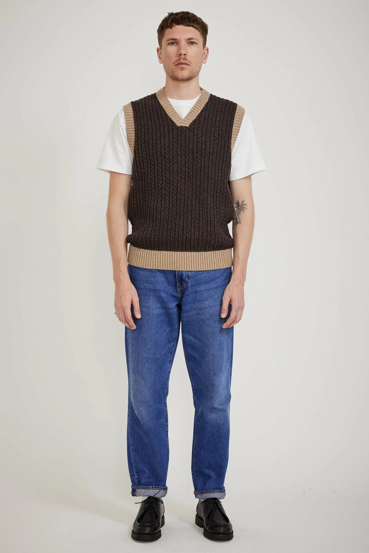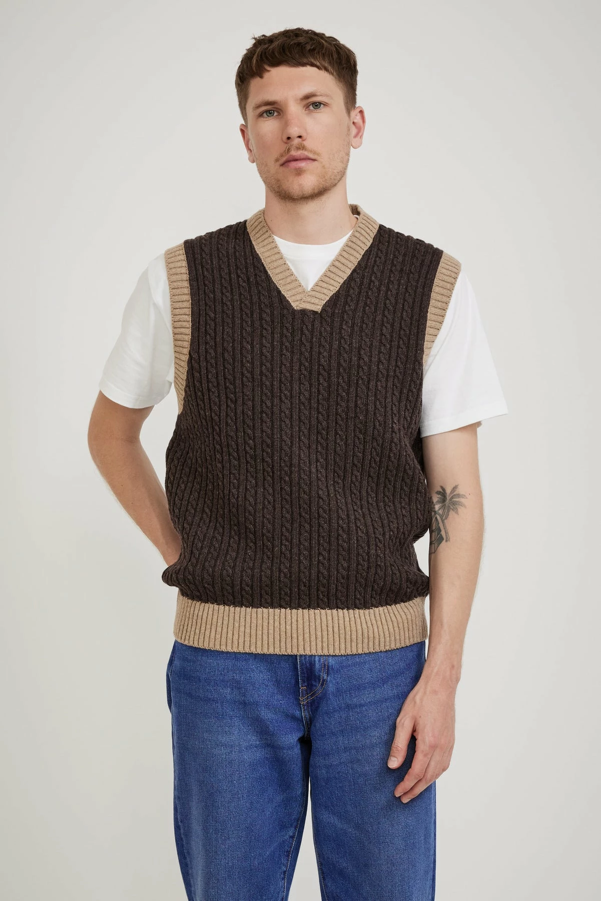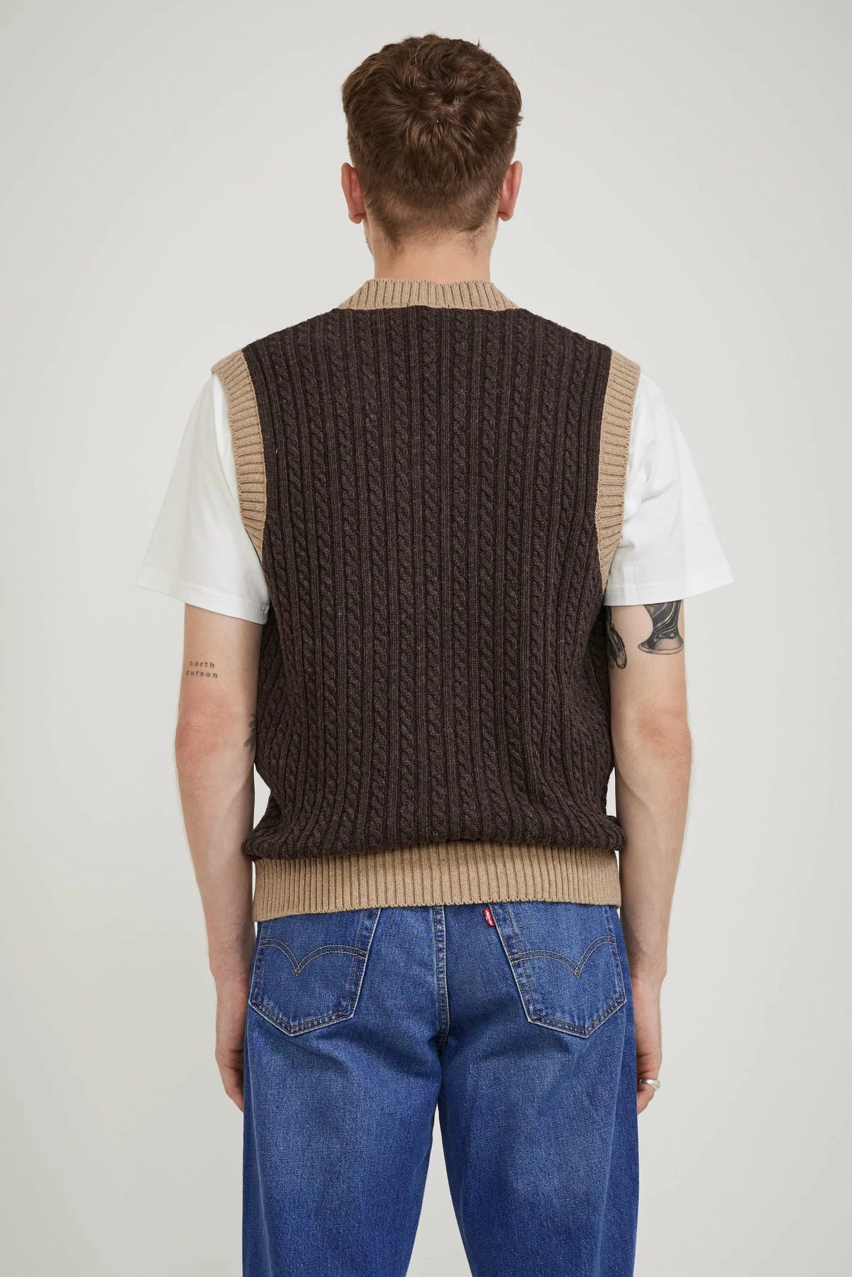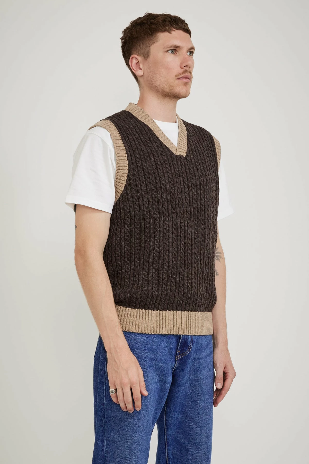 What’s more classic than a cable knit vest? This one from Knickerbocker NYC is crafted from an Italian wool blend with contrasting thick ribbed seams. Boxier shape for a modern aesthetic it has wide shoulders and a long body fit.
